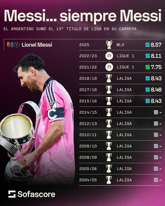 梅西的聯賽冠軍之路始于巴塞羅那,并延伸至巴黎圣日耳曼,如今在邁阿密國際達成新的里程碑。